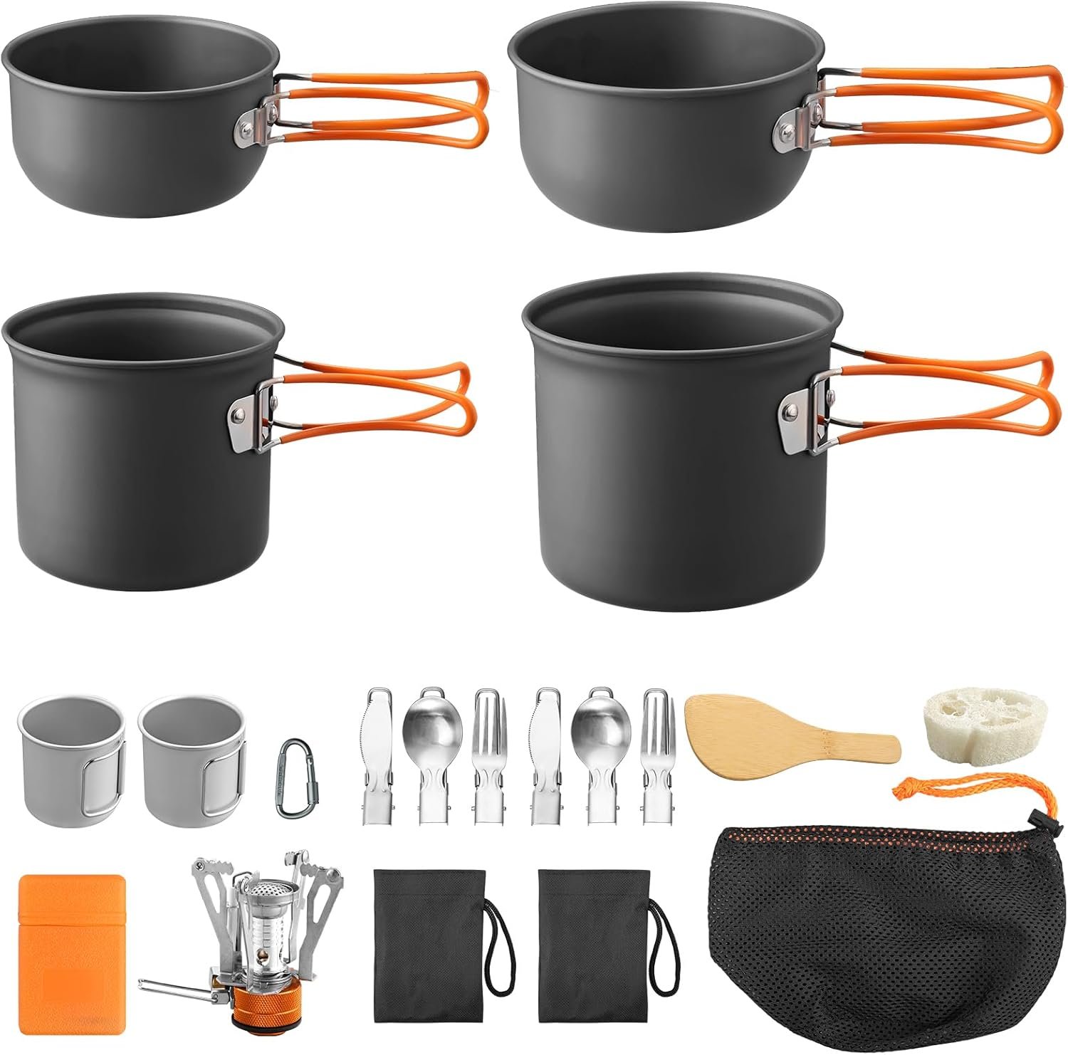 15PCS Portable Camping Cooking Set with Stove Top, Non-Stick Camping Pots and Pans Set, Lightweight Stackable Pot Pan Bowls Soup Spoon with Storage Bag for Camping, Outdoor Cooking
