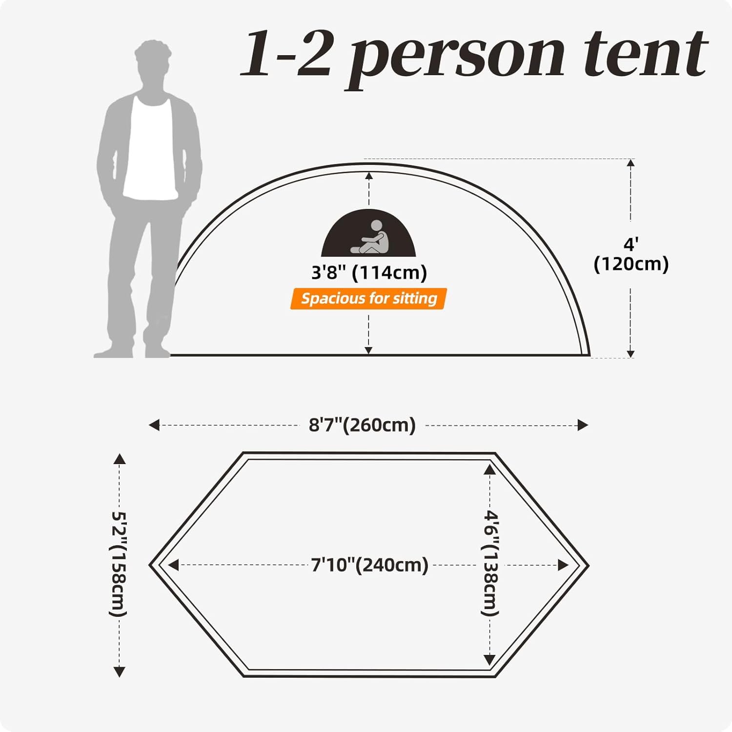 - Lightweight 1-2 Person Tent: This backpack tent is lightweight and has a spacious interior. Weight: 2.2 kg (4.8 lbs), the size of the outer tent is: 260 x 158 x 120 cm (8’7″ x 5’2″ x 4′). Area used in the tent: 240 x 138 x 114 cm (7’10” x 4’6” x 3’8”), and is the ideal outdoor equipment for camping, travel and festivals.